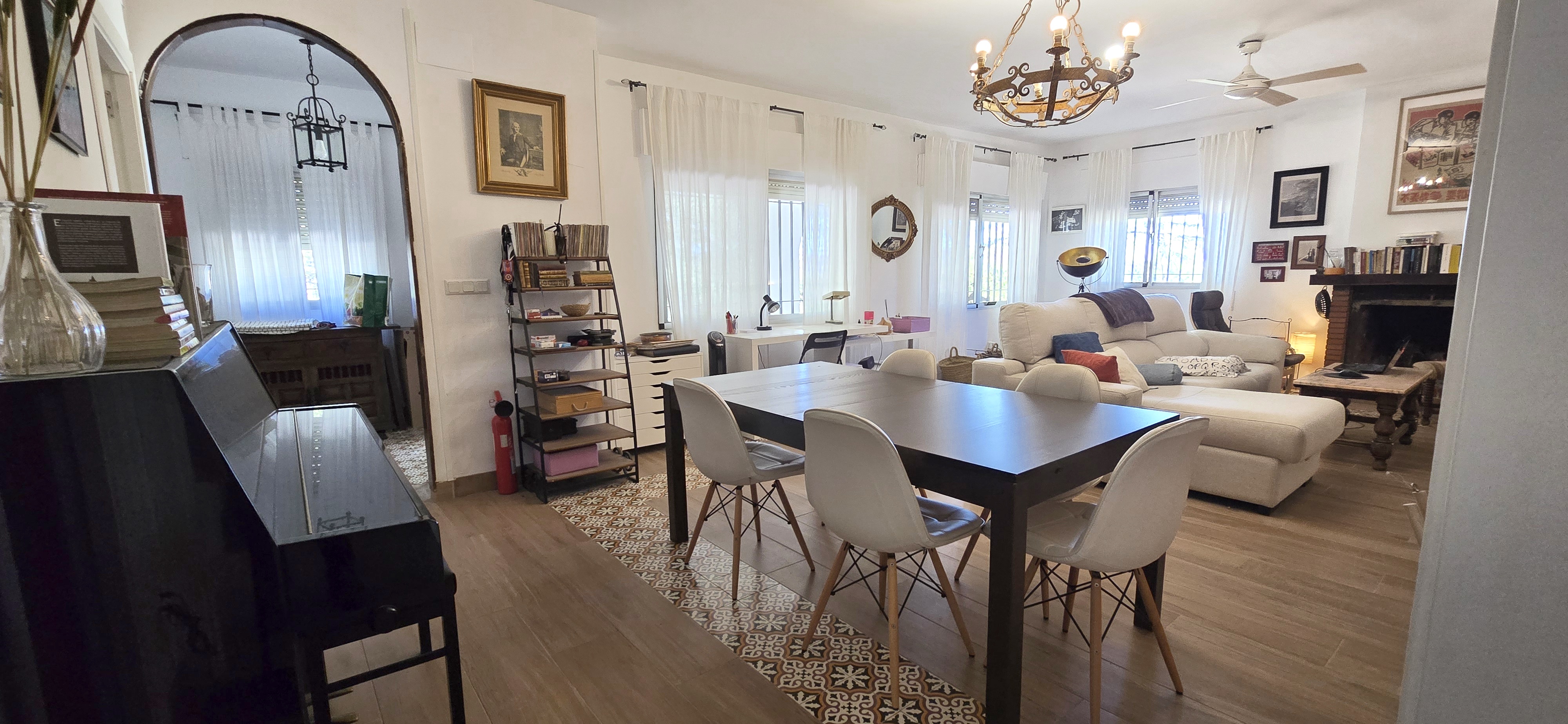 Al entrar en la casa nos recibe un luminoso salón comedor con chimenea, un espacio cálido y acogedor donde imaginar tardes de invierno junto al fuego y largas conversaciones con familia y amigos. La cocina independiente, práctica y luminosa, cuenta con salida directa al porche y al jardín, creando una conexión natural entre interior y exterior.