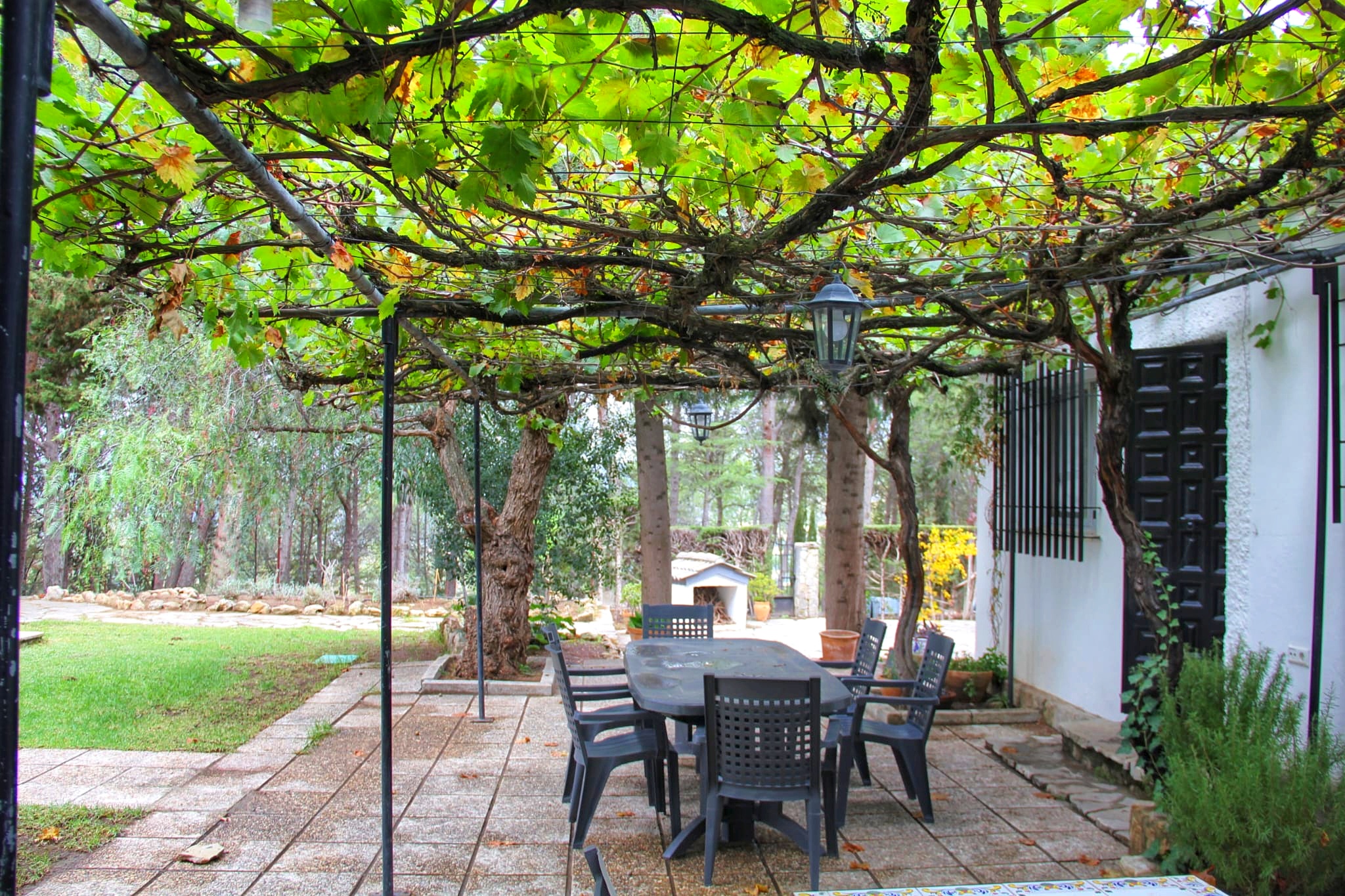 En el exterior, la finca ofrece ese estilo de vida que muchos buscan y pocos encuentran. La casa está rodeada de pinos, que crean una sombra natural muy agradable durante el verano y aportan privacidad y frescor. El jardín se abre hacia una piscina, perfecta para disfrutar de los largos días de sol característicos de esta tierra.