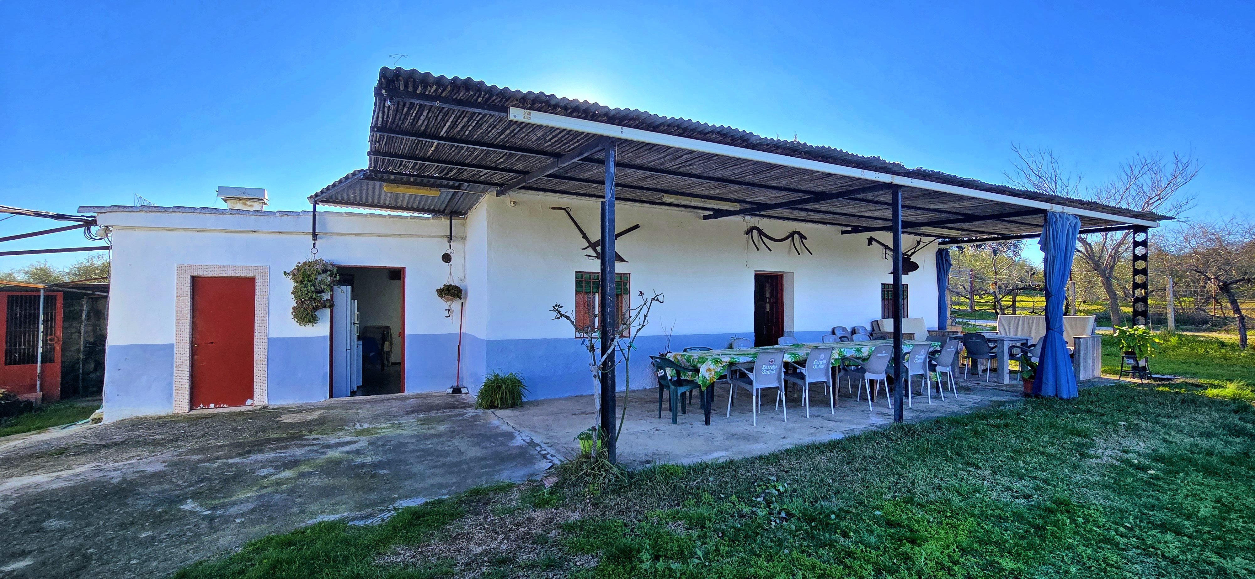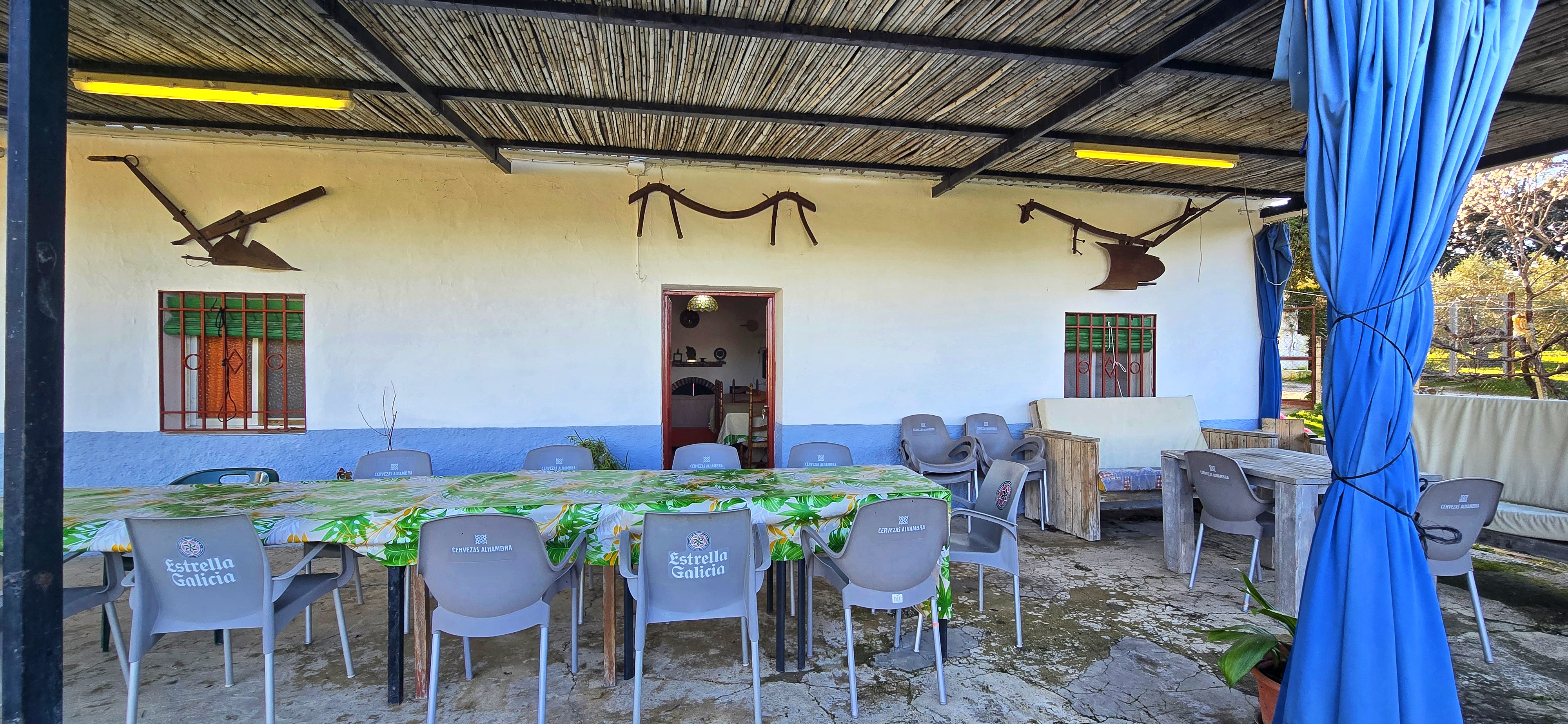 El exterior de esta Finca Rustica es, sin duda, el alma de esta propiedad. Un amplio y elegante porche se abre hacia la zona de jardín y la piscina privada, el lugar perfecto para esas cenas interminables al aire libre o mañanas de café contemplando el paisaje.